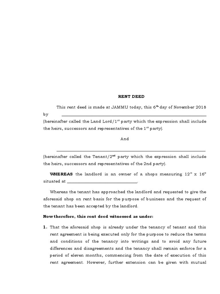 Rent Deed Format PDF Leasehold Estate Landlord